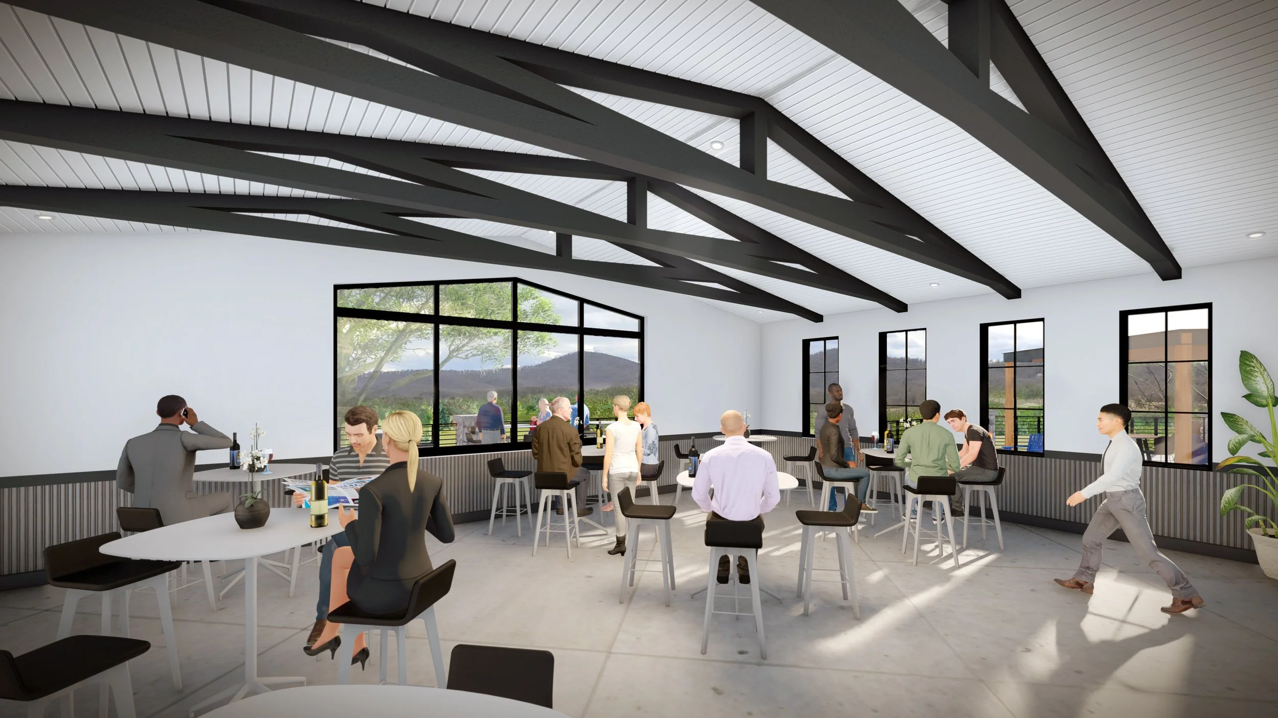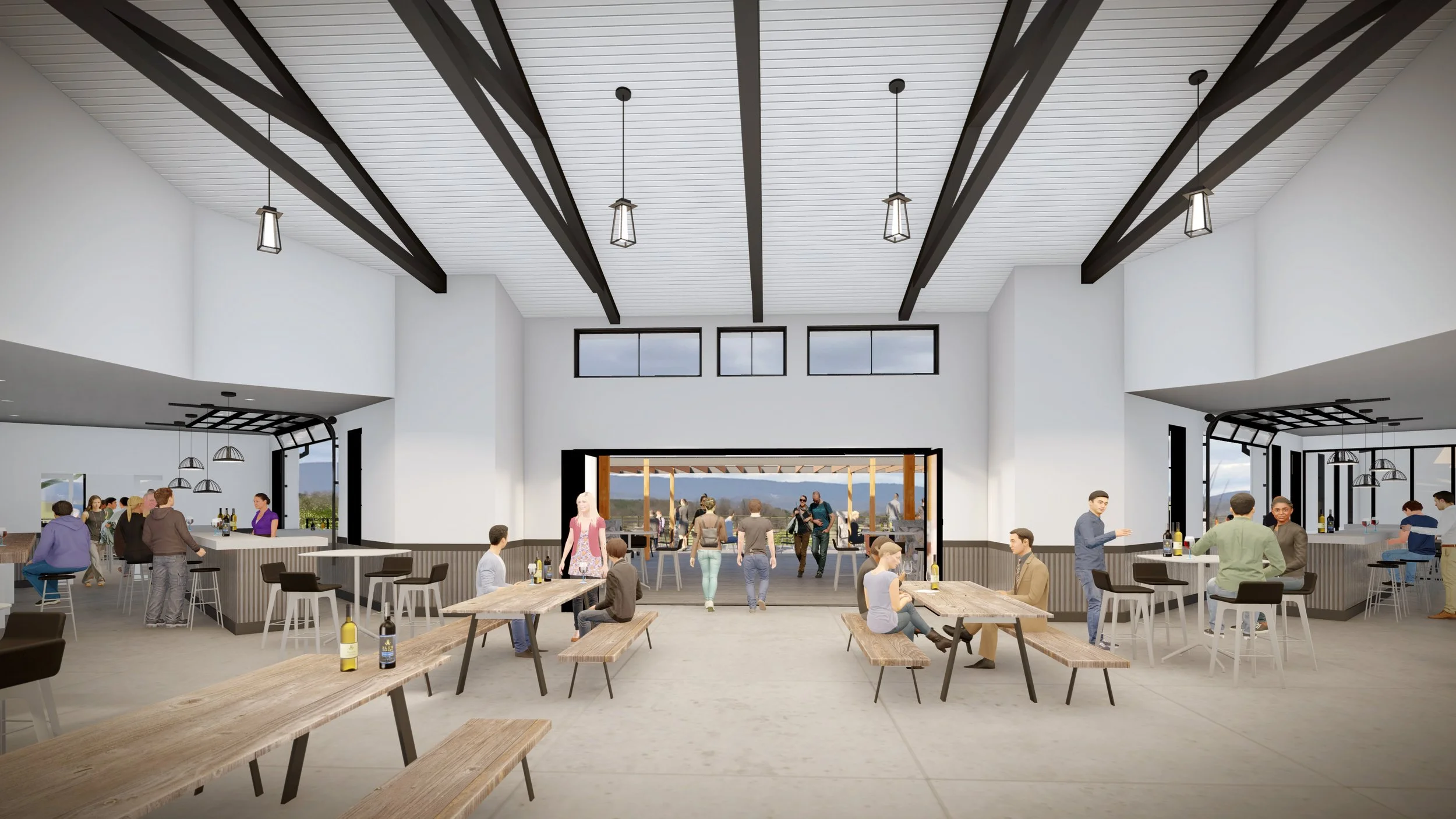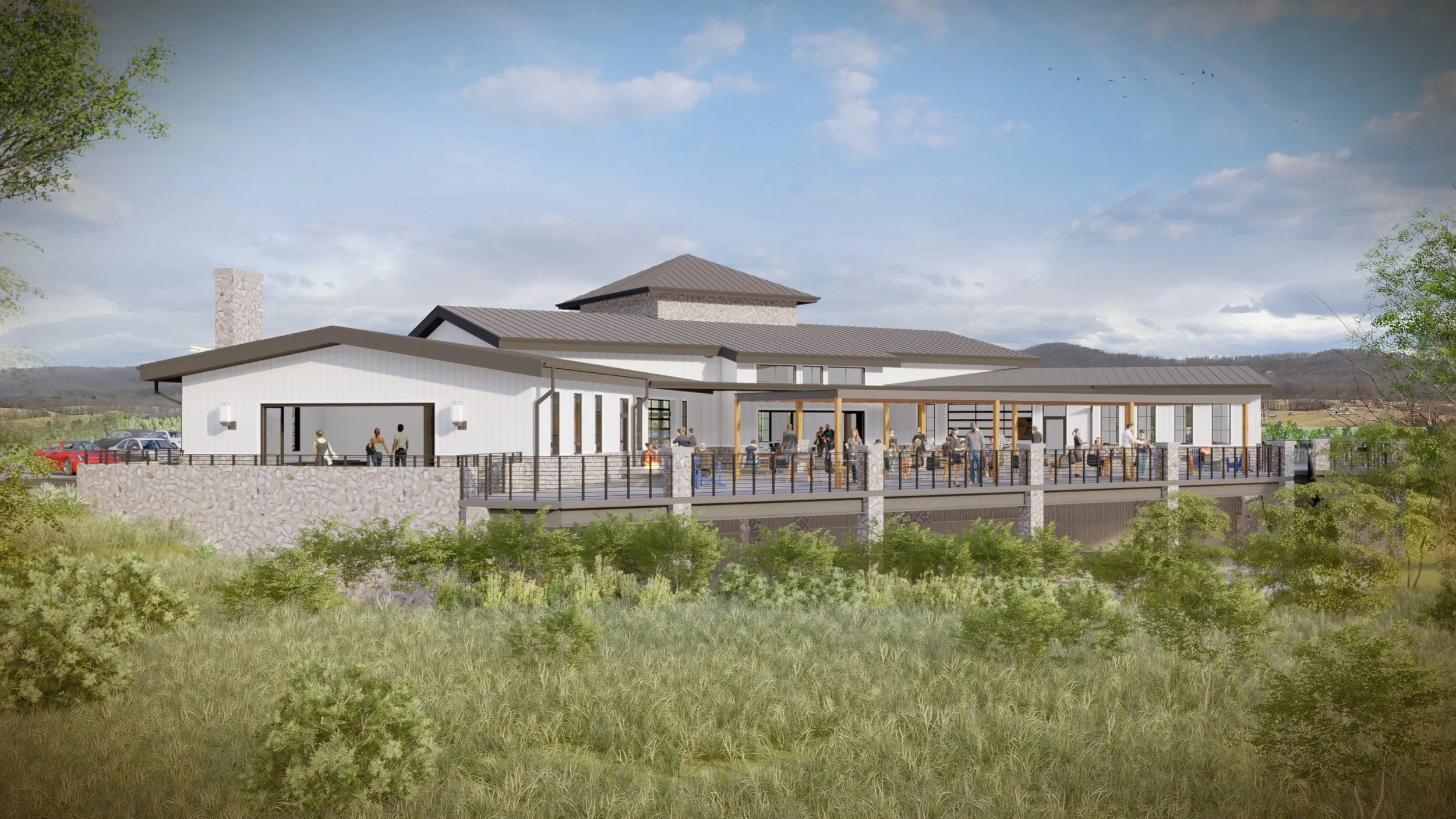 THIS EXPANSIVE TASTING ROOM AND EVENT SPACE IS DESIGNED TO OVER LOOK THE SMOKEY MOUNTAINS WHILE VISITORS ENJOY ONE OF THE MANY WINES THAT BLUE VALLEY HAS TO OFFER. THE SPACE OFFERS LARGE IN DOOR AND OUTDOOR SPACES PROIVING PRIVATE EVENT SPACE AND DYNAMIC OPTIONS FOR ENJOYING THE SURROUNDING VIEWS.