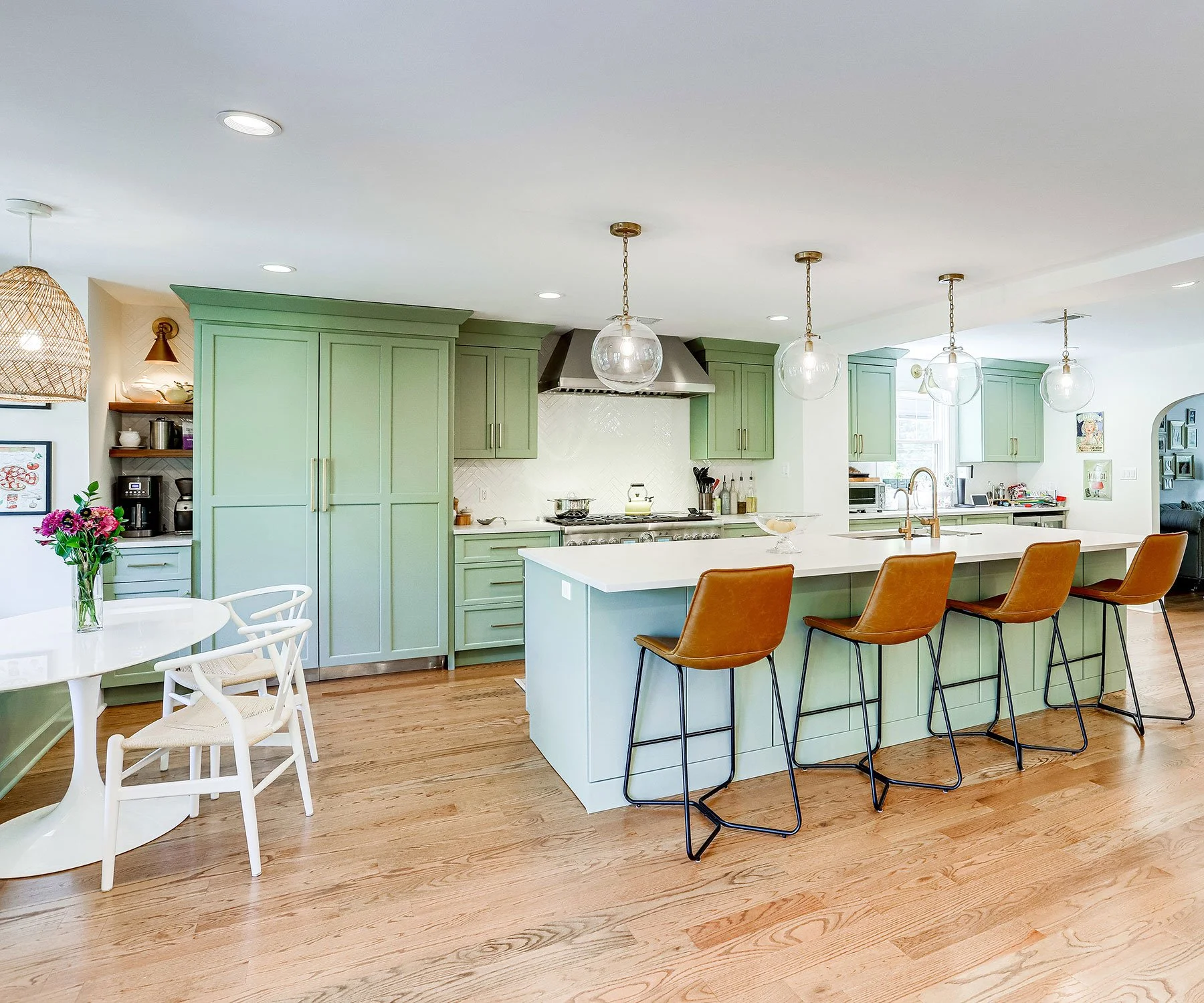 Main objectives of this project included preserving as much of the front front faΓ§ade and existing porch as possible while expanding out back to gain more space for the family to spread out comfortably. The addition allows for great flow between the family/living rooms and kitchen, and creates a seamless transition to the outdoor deck. The open spaces, paired with a cozy breakfast nook and vast island, make this home an entertainer's dream! Our clients curated a beautiful color palette for their re-imagined homeβwe think the pops of blues and greens create such a calm and complimentary space.
